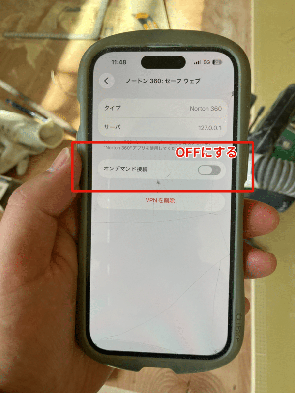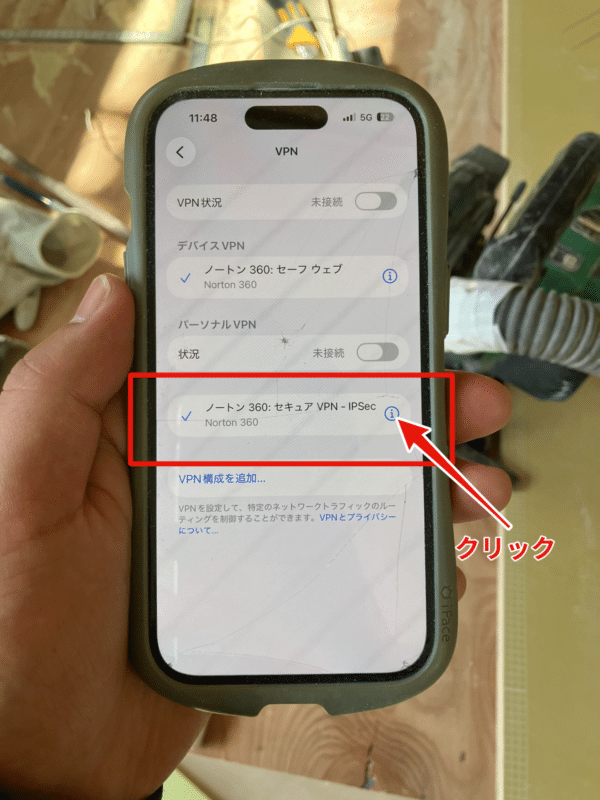 画面上部に「VPN」アイコンが表示されているかどうか。iOS設定の中に「VPN」が赤枠のように表示されているかどうか。